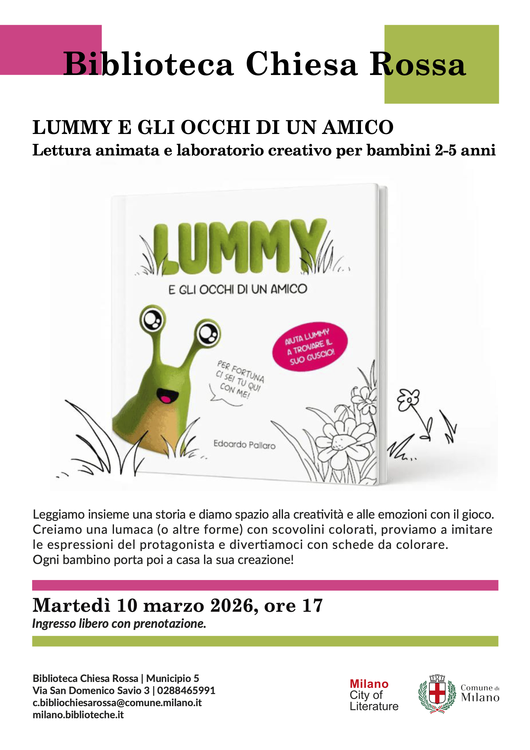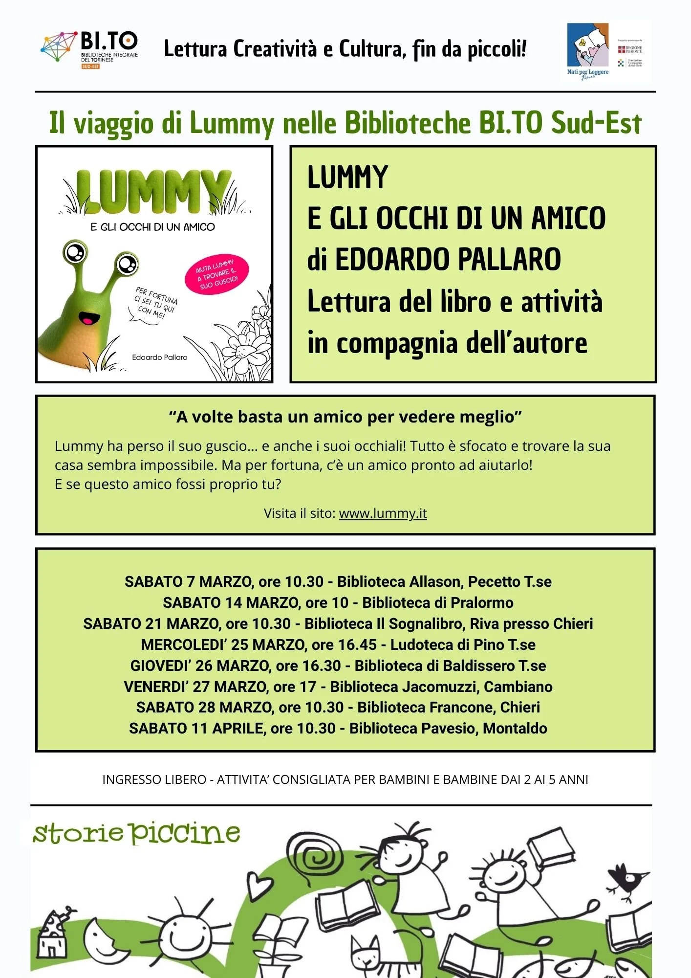 Il libro viene proposto a bambine e bambini nell'ambito del progetto Nati per Leggere, attraverso laboratori itineranti che si svolgeranno nelle biblioteche BI.TO Sud-Est (Chieri, Pecetto Torinese, Cambiano, ...).